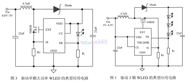 YB1205B是一種輸入電壓范圍寬(0.8~5.5V),可調(diào)恒定電流和限定電流兩種模式來(lái)驅(qū)動(dòng)白光LED而設(shè)計(jì)的升壓型DCDC變換器。采用變頻模式,逐周期限流,使輸入輸出電流隨電源電壓降低均勻變化。該器件能利用單節(jié)或雙節(jié)干電池驅(qū)動(dòng)單顆大功率白光LED,同樣可以利用一節(jié)鋰電池驅(qū)動(dòng)兩顆、三顆或多顆WLED。驅(qū)動(dòng)WLED串聯(lián)連接的方法可以提供相等的WLED電流,從而獲得均勻的亮度